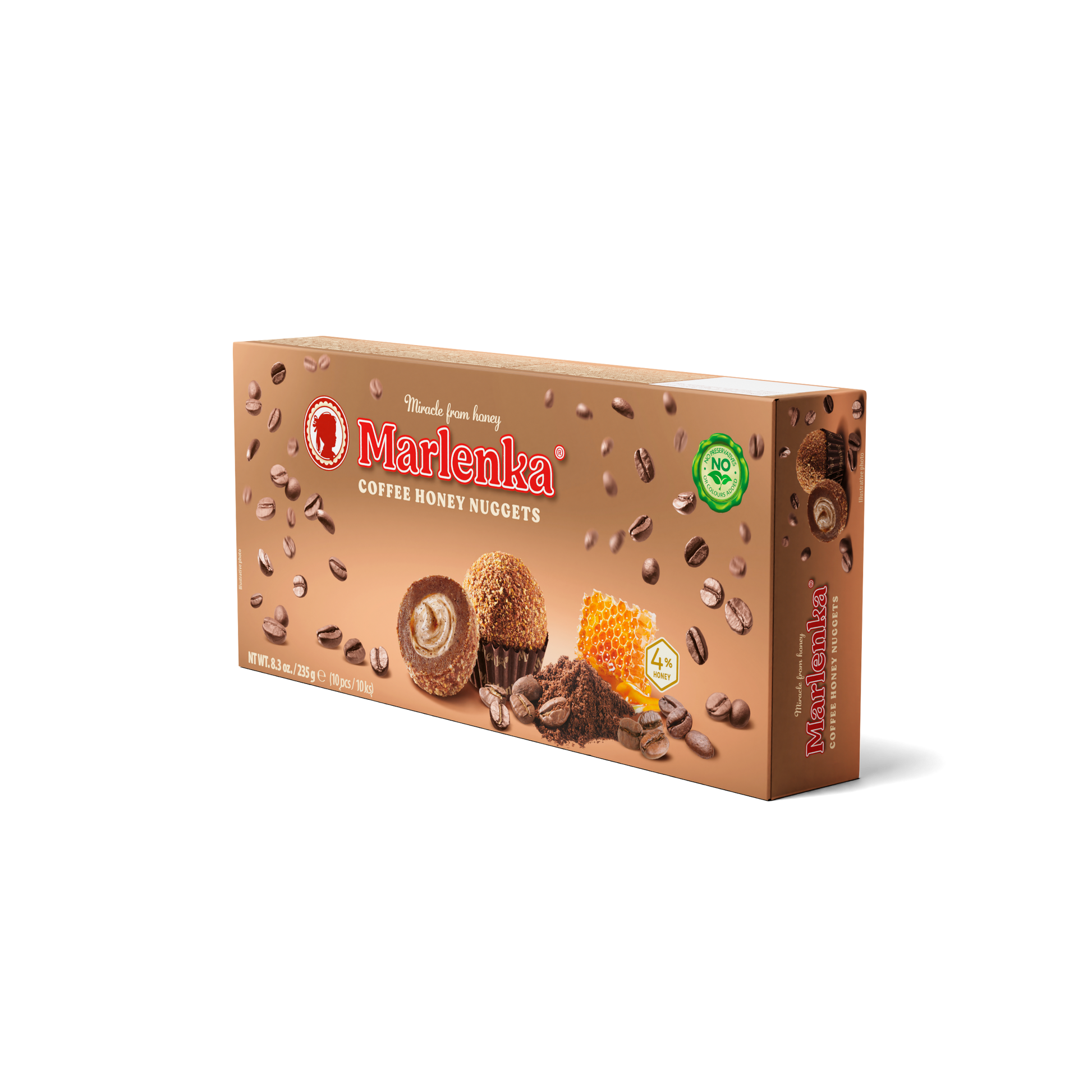 MARLENKA® new coffee nuggets are a perfect combination of the classic honey cake and cocoa. Their exceptional taste is accompanied by 2 % of original MARLENKA® café Crema coffee, both in the pastry and in the delicious creamy filling. In a single bite you can enjoy the harmonious texture of the supple pastry, coffee creamy filling, and the taste of honey. Presented in lovely packaging are made according to an old Armenian family recipe.